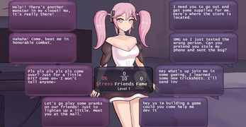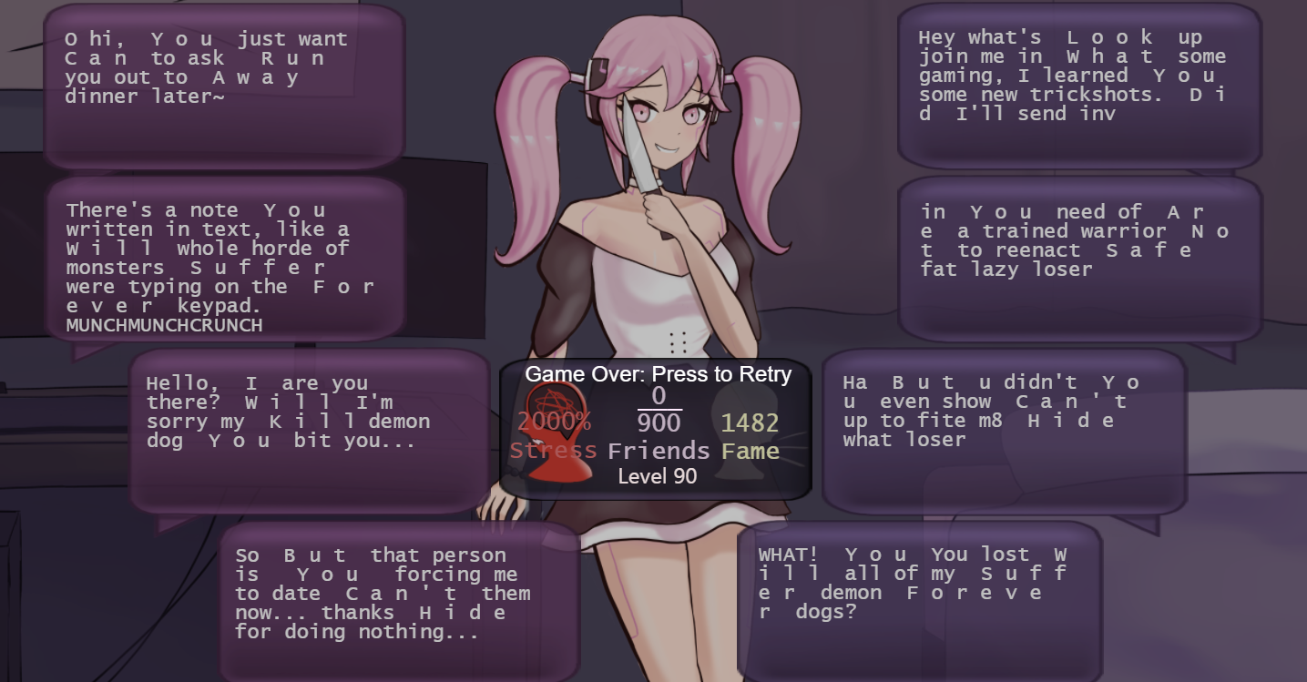 -boss battles- every 10 levels, Chatsy goes absolutely insane on you, unleashing everything she's got, and taking out her trusty Machi (the knife).